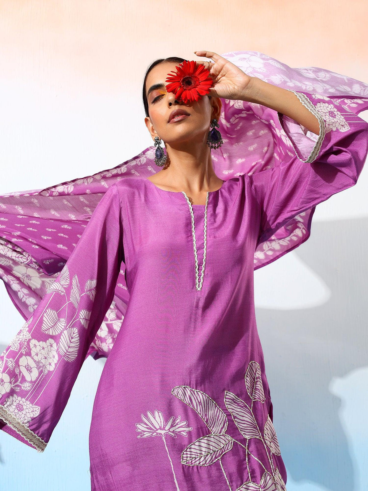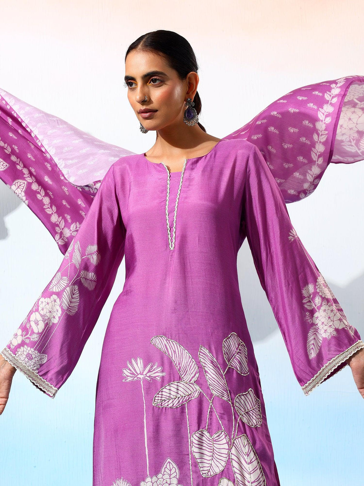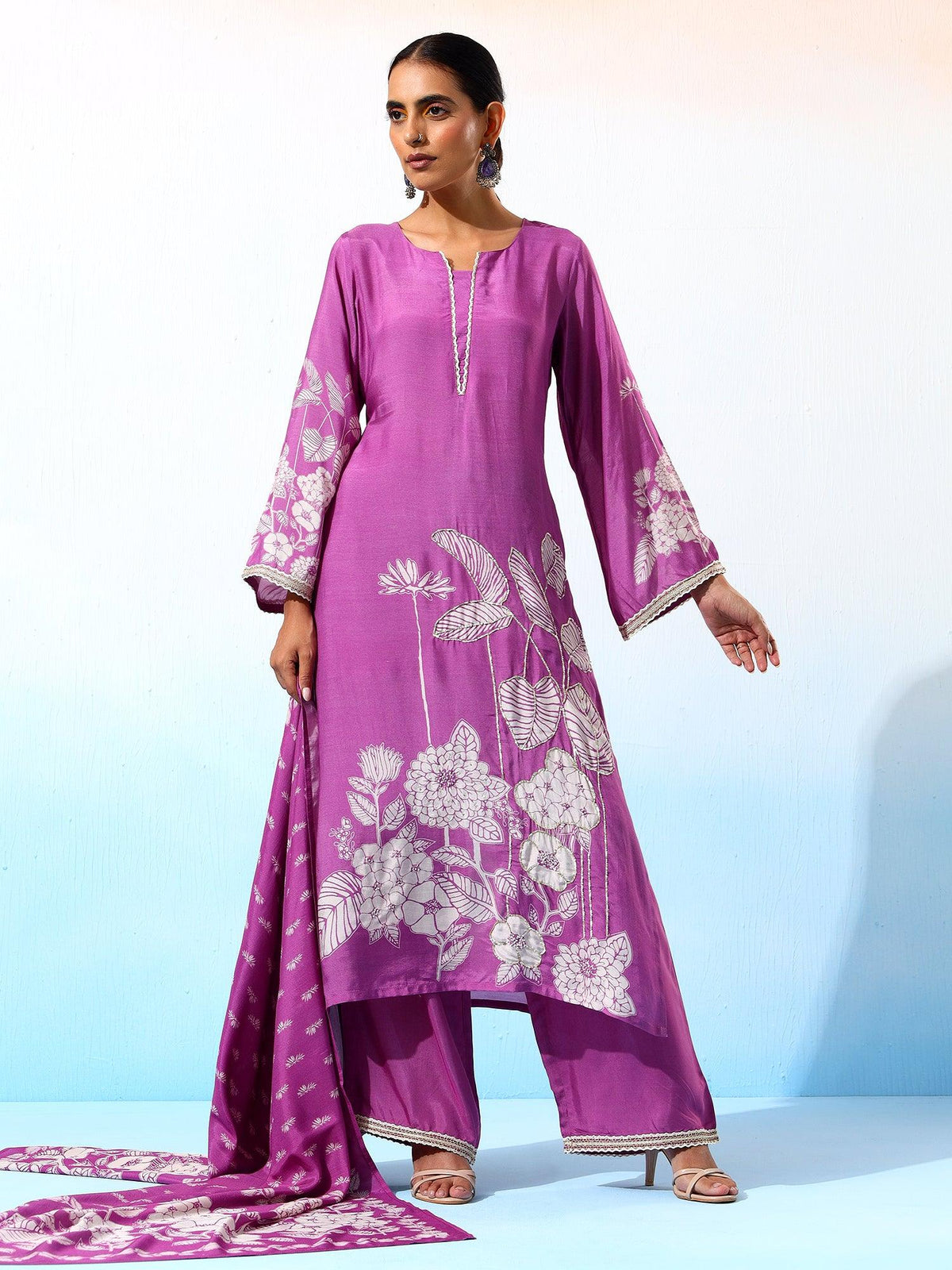 Discover the elegance of our Fariha Silk Purple Printed Kurta Set, a stunning addition to your ethnic wear collection. This women's kurta set features a beautifully floral-printed kurta, designed in a straight shape with a regular style that offers a flattering silhouette. The kurta’s round neck and three-quarter flared sleeves enhances its classic charm, while the pocket adorned with beads and stones adds a touch of refined detail. The calf-length kurta is crafted from pure silk with a machine weave finish, ensuring a luxurious feel and a sophisticated look. The set is completed with solid purple palazzos, which feature a partially elasticated waistband and a slip-on closure for comfort and ease. Both the kurta and palazzos are made from pure silk, providing a seamless blend of style and comfort.