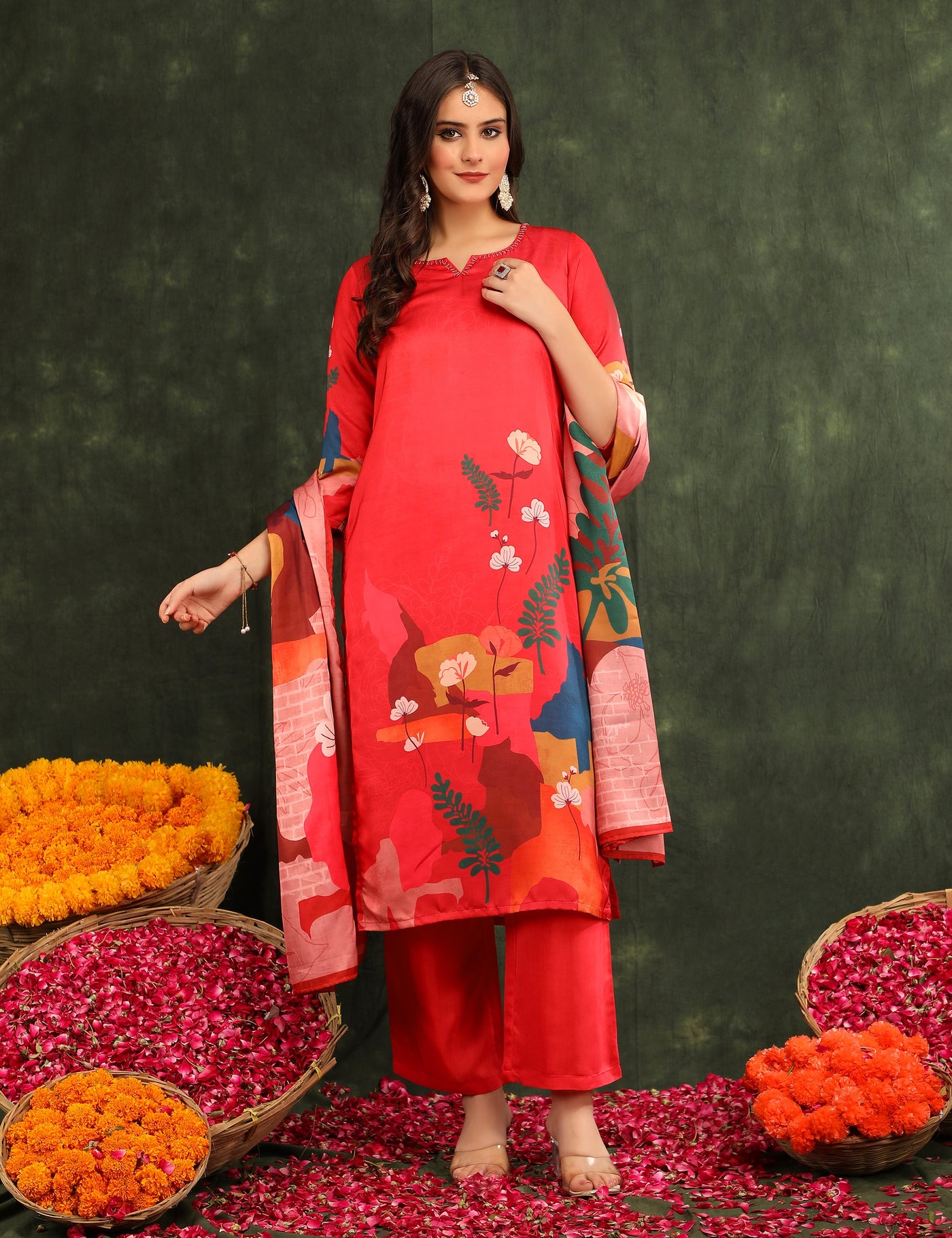 Radiate joy and traditional charm in this stunning red three-piece ethnic set. The kurta blossoms with a beautiful floral print, which is artfully highlighted by delicate thread work, adding a layer of texture and handcrafted elegance to the vibrant design.