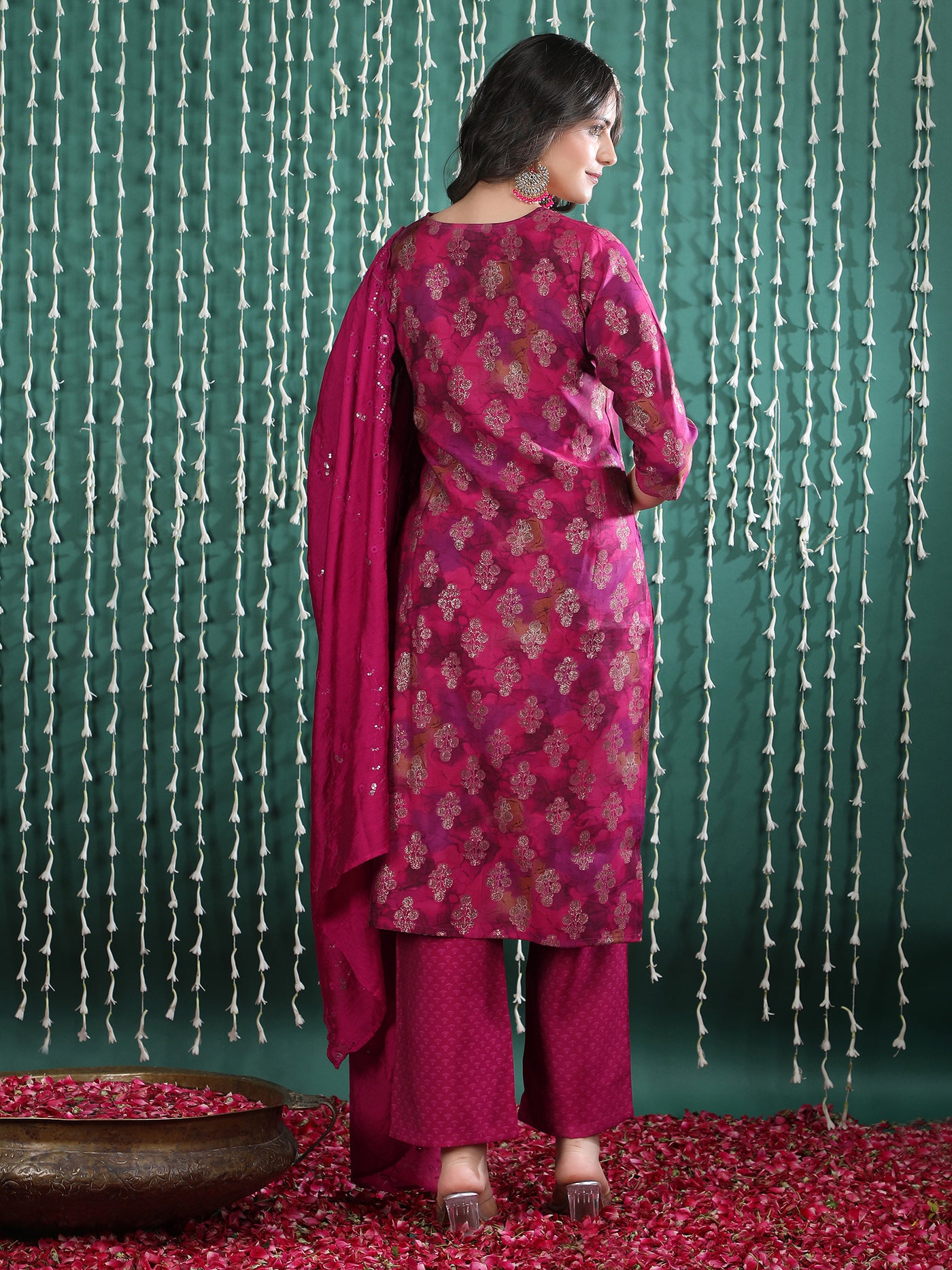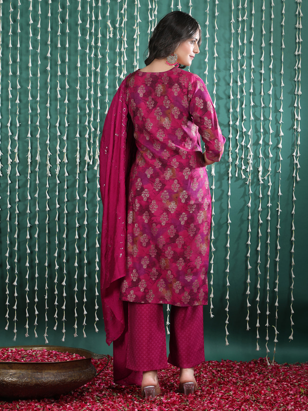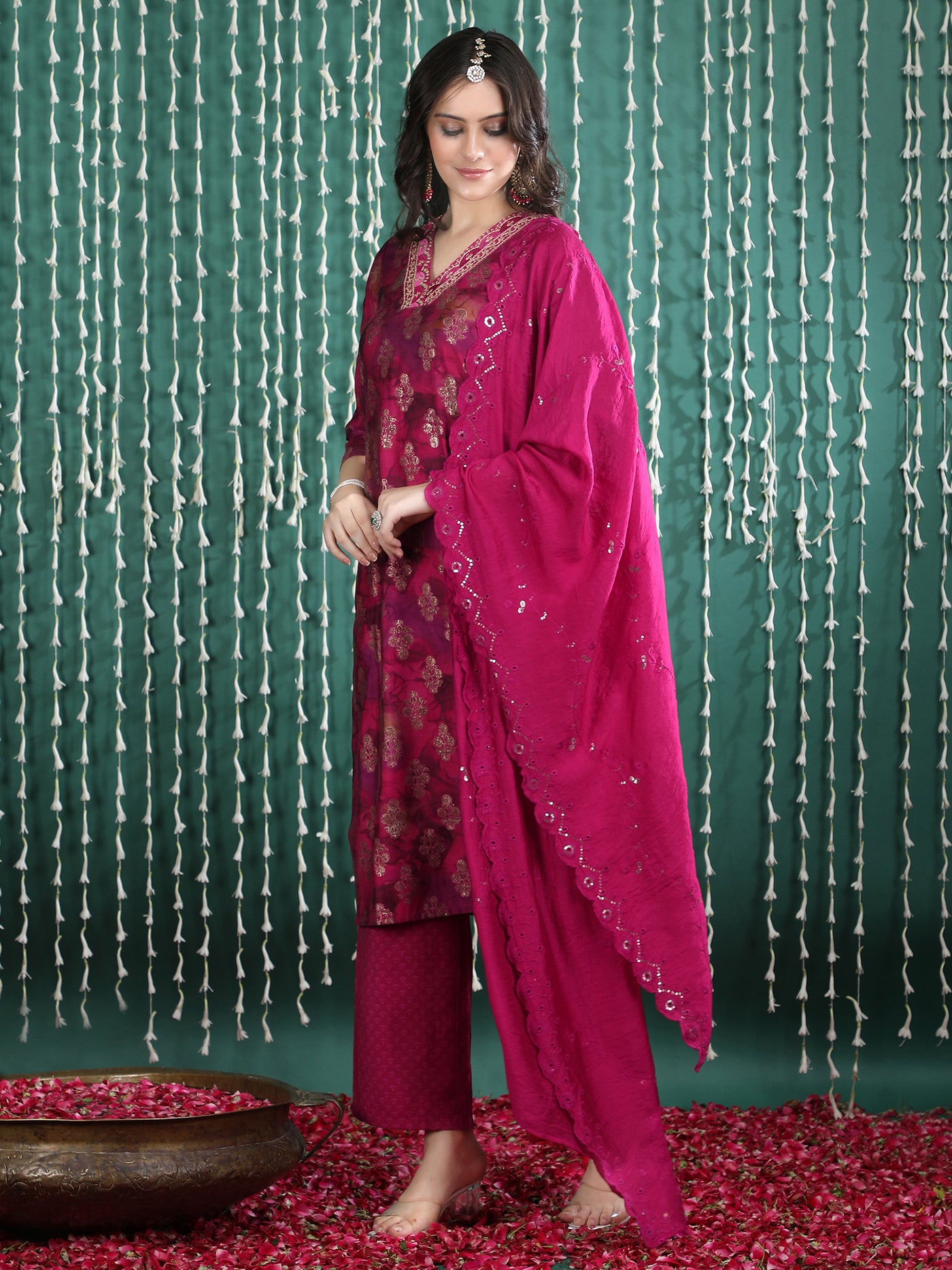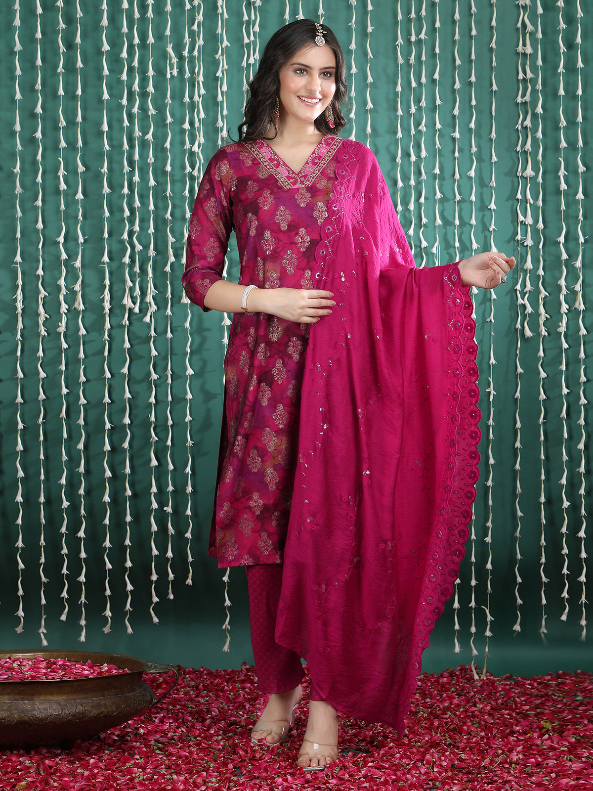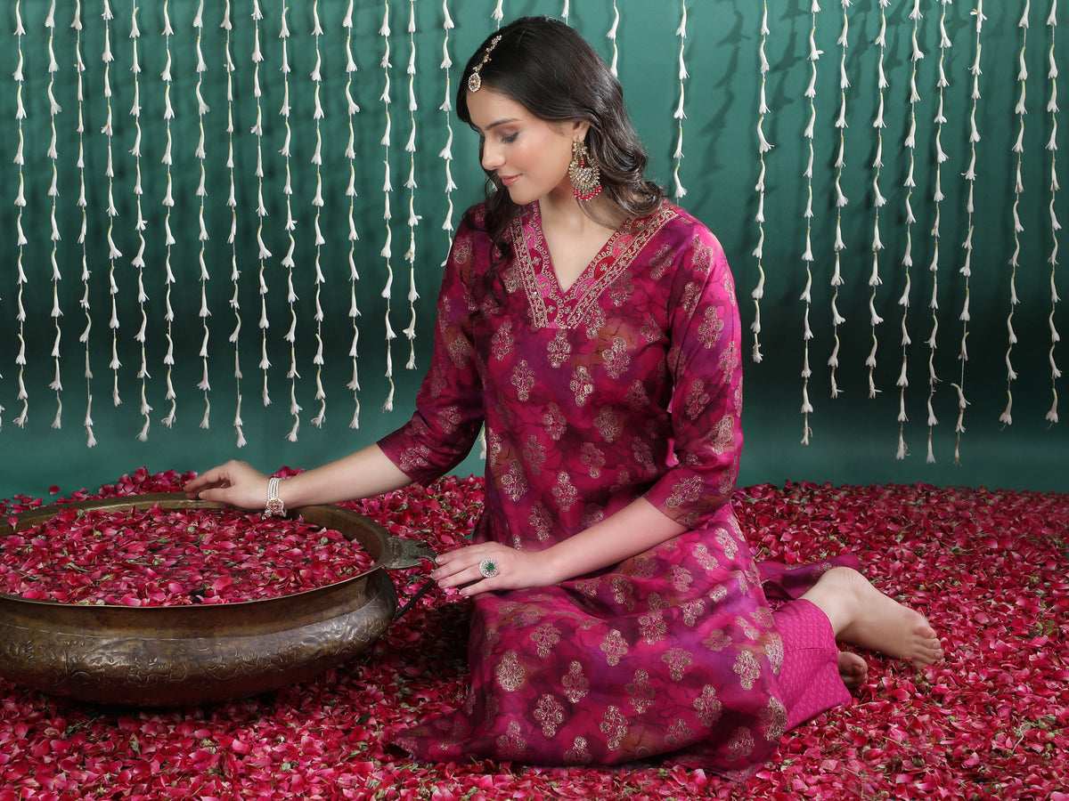 Immerse yourself in the deep, sophisticated charm of FUCHSIA with this graceful ethnic set. The rich maroon kurta is adorned with elegant ethnic prints, given a touch of artisanal beauty by fine thread work. This subtle detailing adds depth and texture, enhancing the luxurious feel of the design.